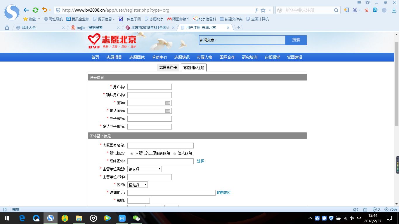 2、在弹出的“志愿团体注册”页面中逐项填写基本信息,标*号为必填项。